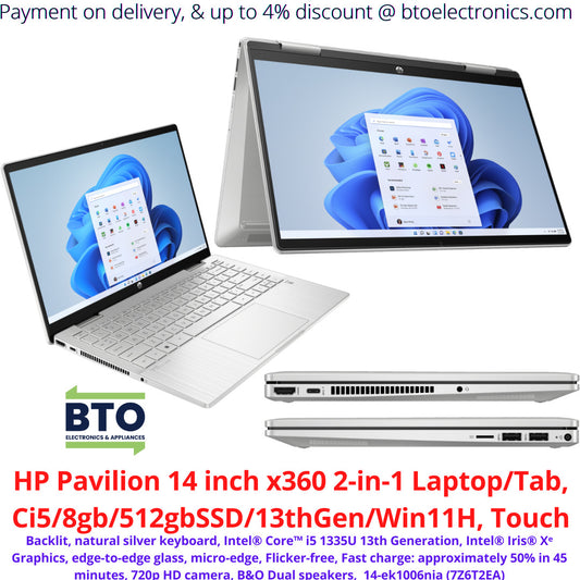 HP Pavilion 14 inch x360 2-in-1 Laptop/Tab, C15/8gb/512gbSSD/13th Gen/Win11H/Touch